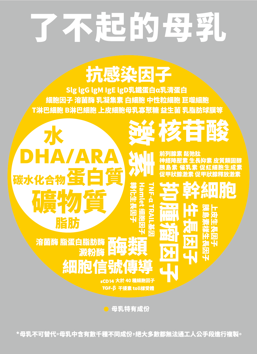 Medela(美德樂)致力於母乳研究。母乳包含了寶寶身體和大腦發育所需的所有營養成分,並且還能很好地適應寶寶成長的需要。母乳中的營養成份種類是配方奶粉的5倍以上,而且含有豐富的維生素、礦物質、脂肪酸和增強免疫功能所需的各種重要抗體。最近研究發現,母乳中還含有寶寶全面生長發育所需的幹細胞。