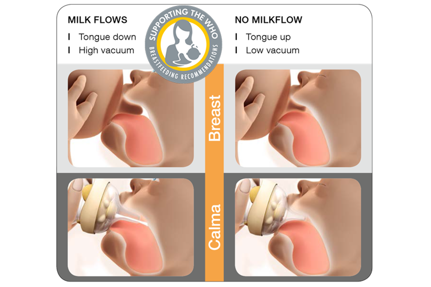 Calma 集成了負壓控制閥,這意味著嬰兒需要形成口腔負壓並使用與哺乳相似的舌頭動作,才能吸出乳汁。