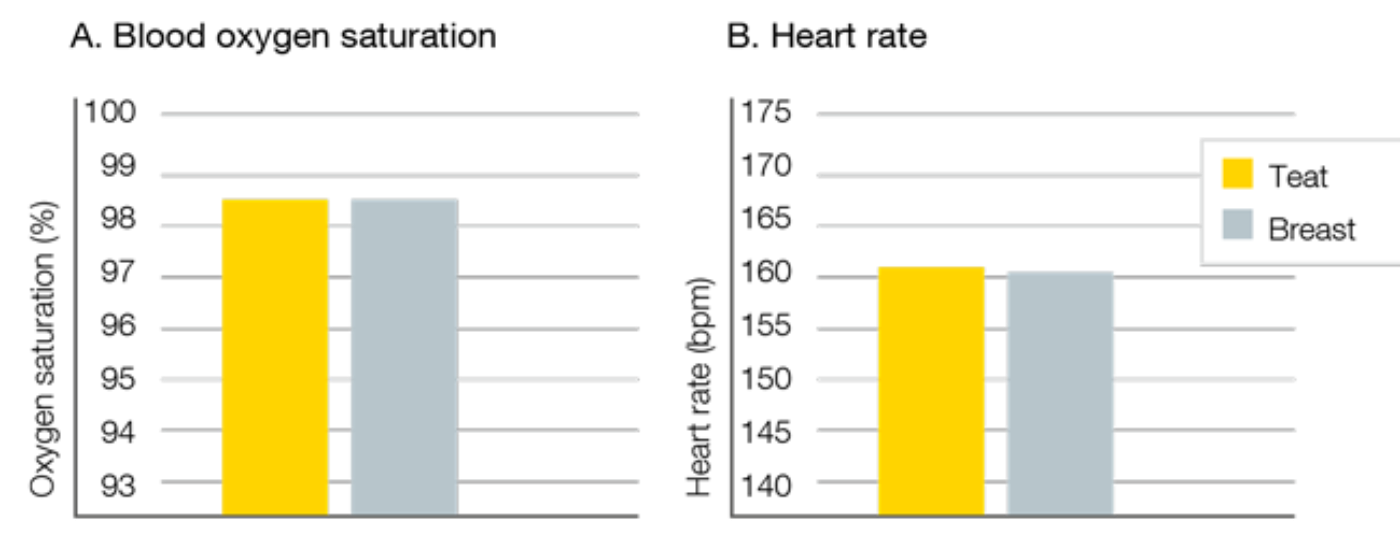 這項比較了哺乳和親餵模擬奶嘴的研究中,發現是兩種哺餵方法在一下結果上有相似性: