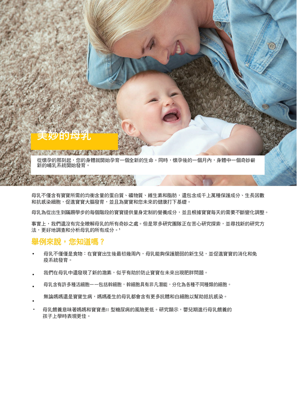 母乳不僅含有寶寶所需的均衡含量的蛋白質、礦物質、維生素和脂肪,還包含成千上萬種保護成分、生長因數和抗感染細胞,促進寶寶大腦發育,並且為寶寶和您未來的健康打下基礎。