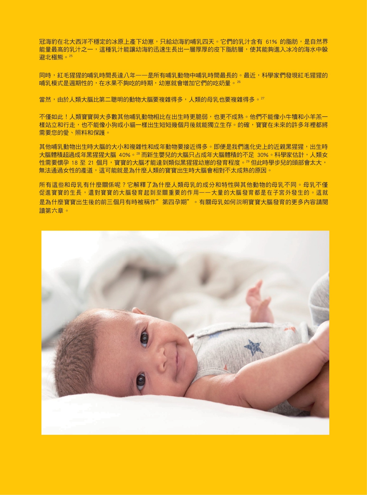 所有這些和母乳有什麼關係呢?它解釋了為什麼人類母乳的成分和特性與其他動物的母乳不同。母乳不僅促進寶寶的生長,還對寶寶的大腦發育起到至關重要的作用——大量的大腦發育都是在子宮外發生的。這就是為什麼寶寶出生後的前三個月有時被稱作‘第四孕期’。有關母乳如何説明寶寶大腦發育的更多內容請閱讀第六章。