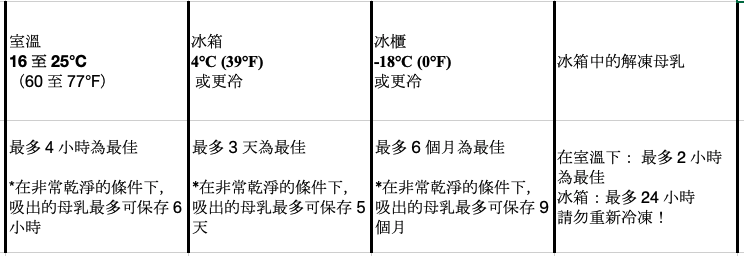 注意事項: 上述有關母乳儲存和解凍的指南僅作參考建議。國家及醫院內部的指南和標準或有所不同。