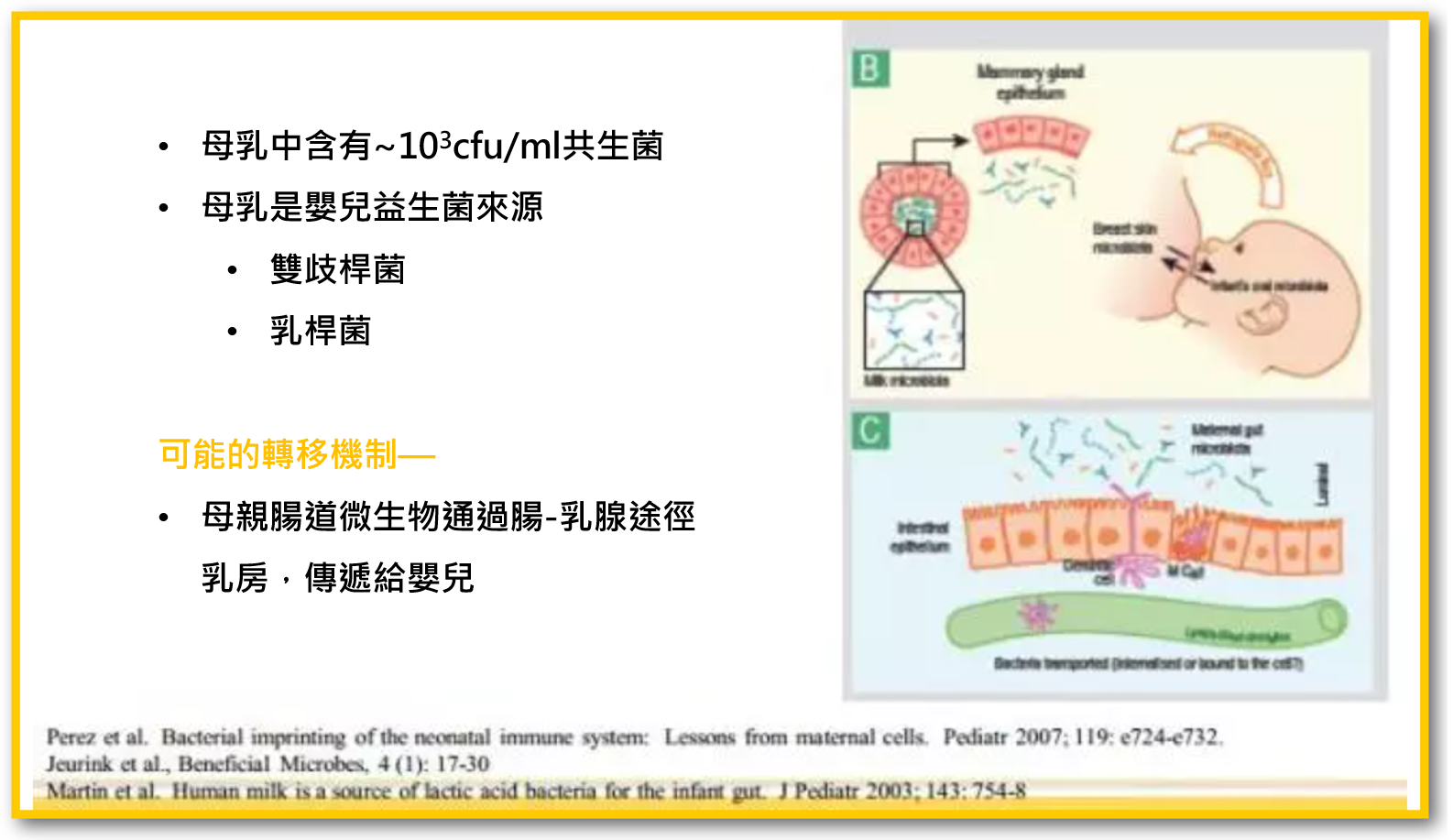 母乳中益生菌到底來自何處,現在沒有明確的研究結果,但是有大家公認的一個假說”腸乳腺途徑”,也就是母乳中的益生菌來自於媽媽的腸道。