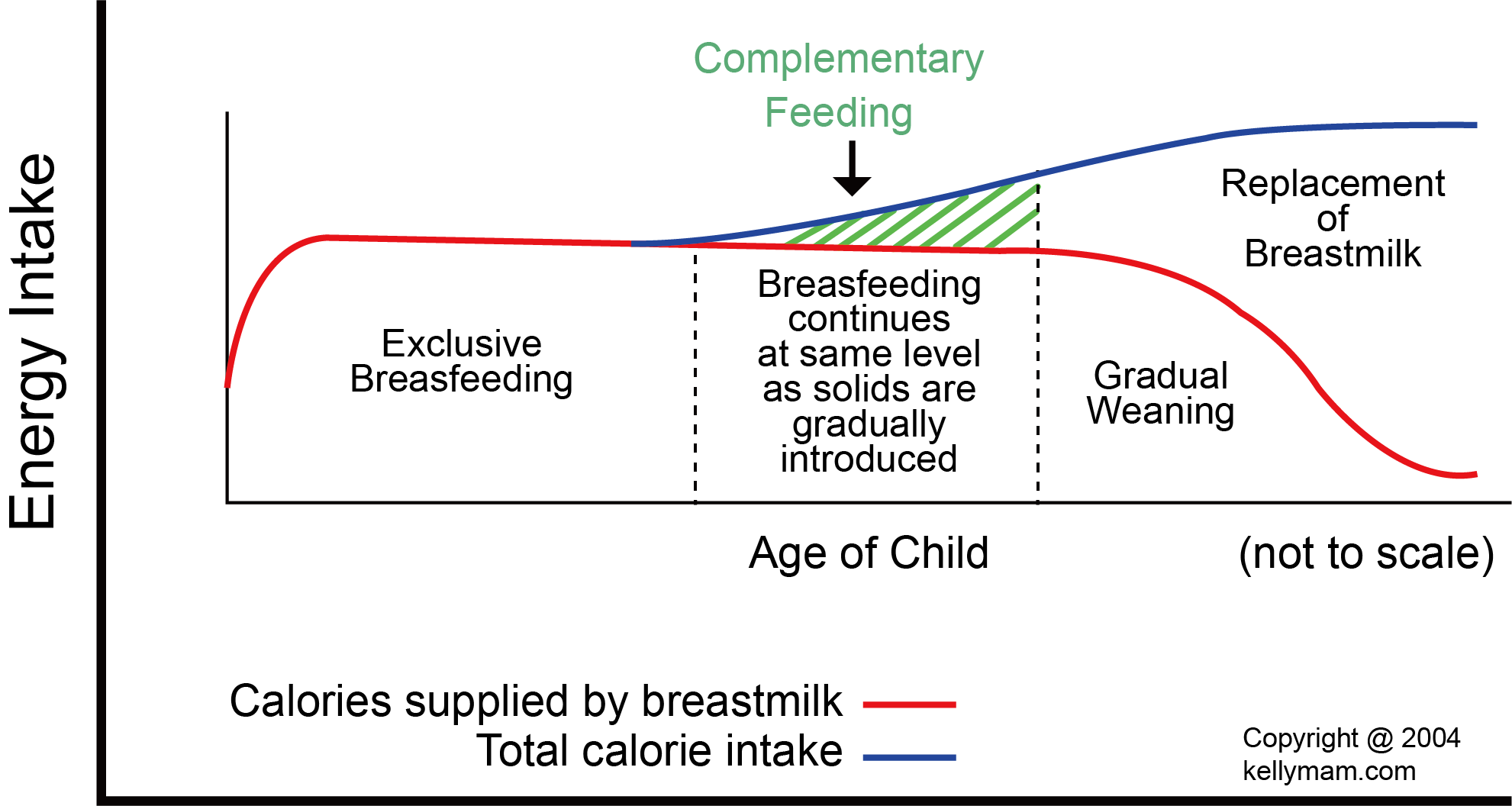 藍線代表總的熱卡需求,紅線代表母乳提供的熱卡。
