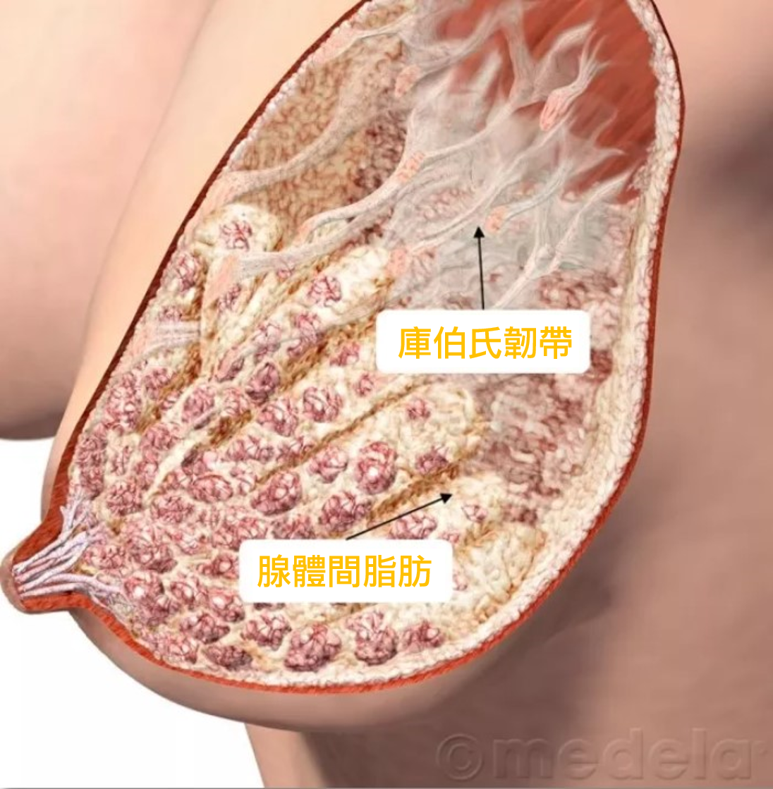 讓我們來看一下乳房的結構,利用我們學過的物理知識,乳房主要受到向下的地心引力和向上的庫伯氏韌帶的拉力。