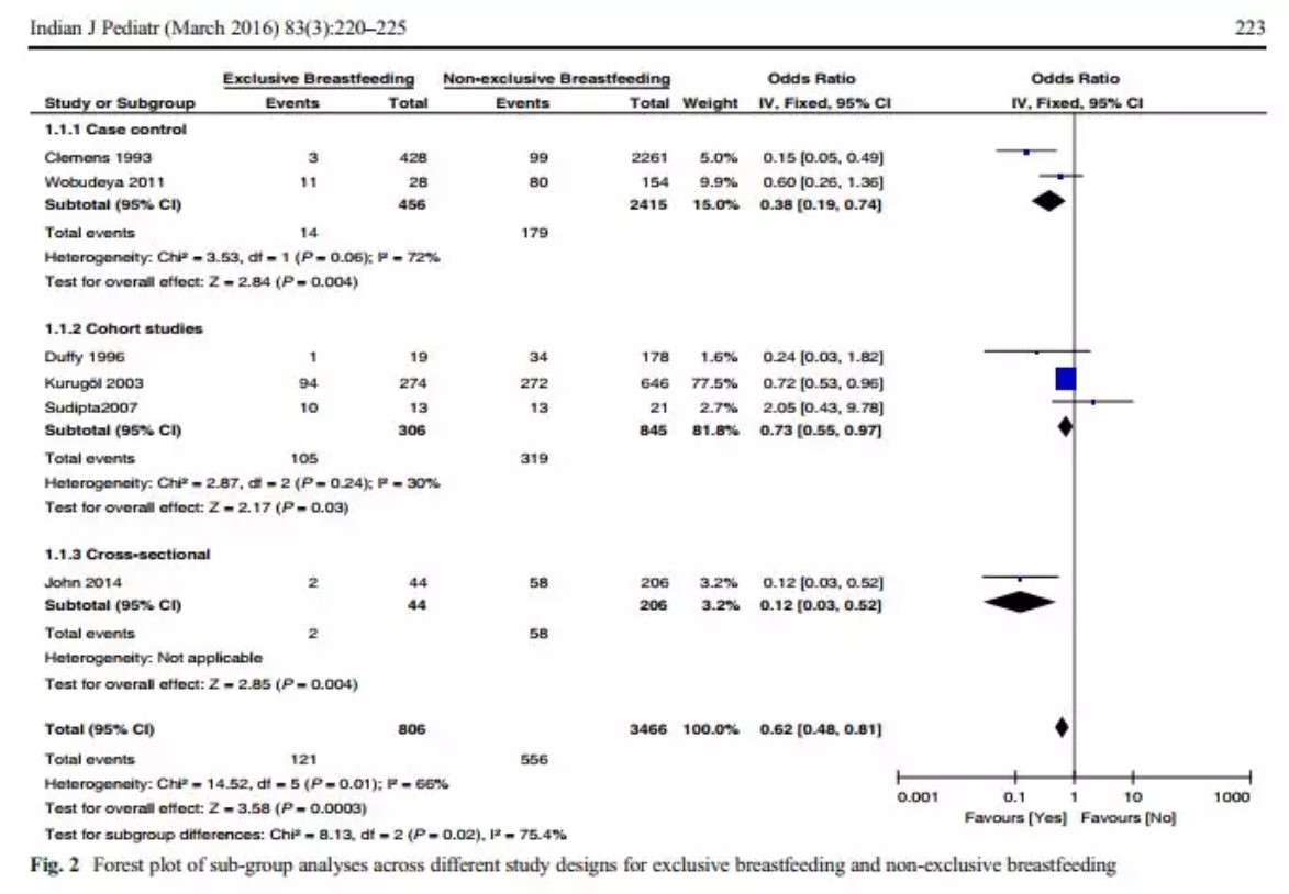 圖片說明:不同研究中母乳餵養與輪狀病毒發生率的相關性,匯總結果表示母乳餵養可以降低輪狀病毒的發生率。【 OR(比值比)<1:意味著母乳有助於降低輪狀病毒風險。表示95%CI 可信區間的橫線與1的分隔號相交時表示兩者沒有顯著差別。】
