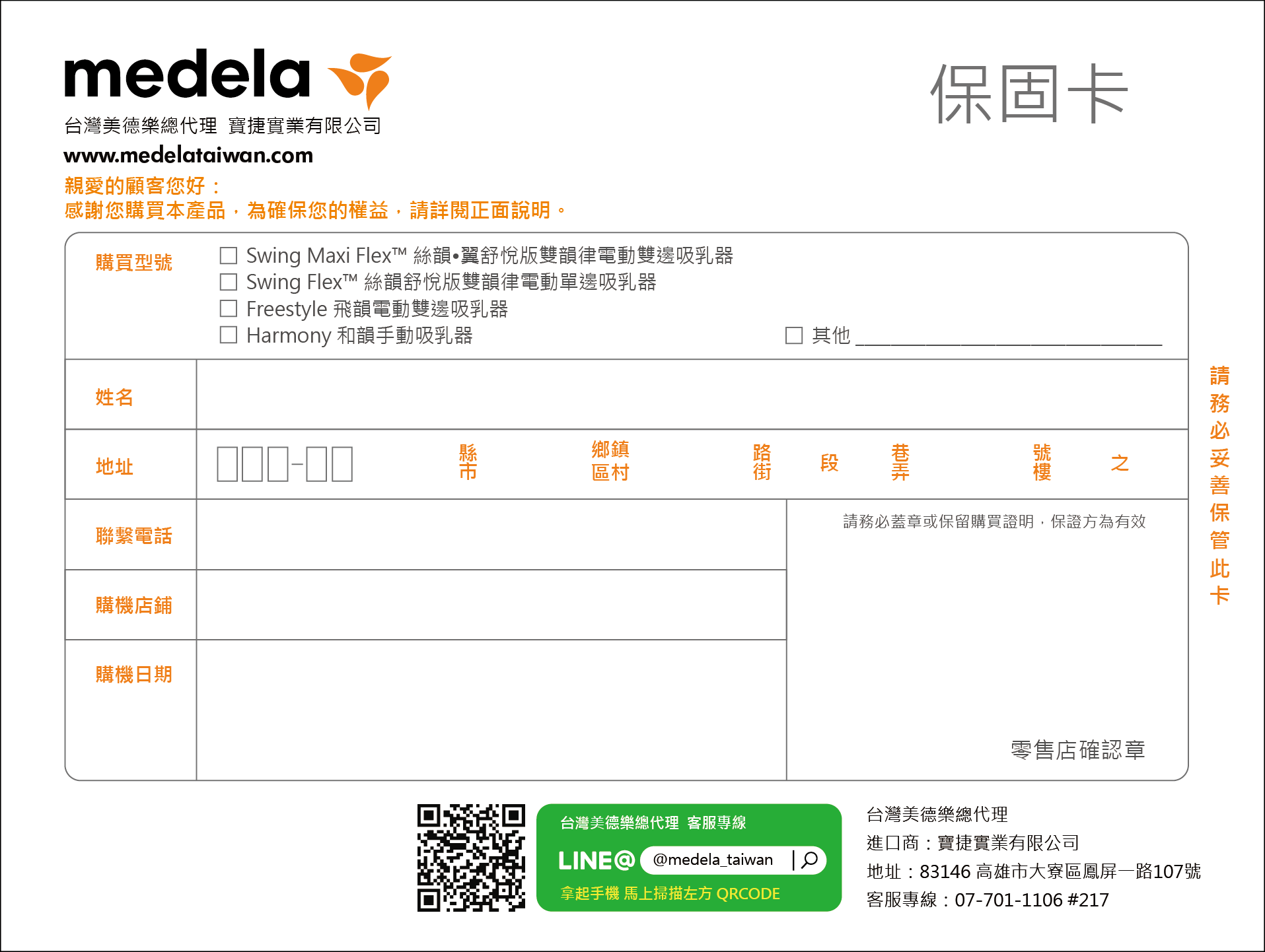 產品維修時,請提供美德樂產品保固卡,附加蓋購零售店確認章及寶捷實業有限公司代理章;若為網路購買,則附加蓋寶捷實業有限公司確認章。若維修時未附美德樂產品保固卡,另收基本檢測費用。