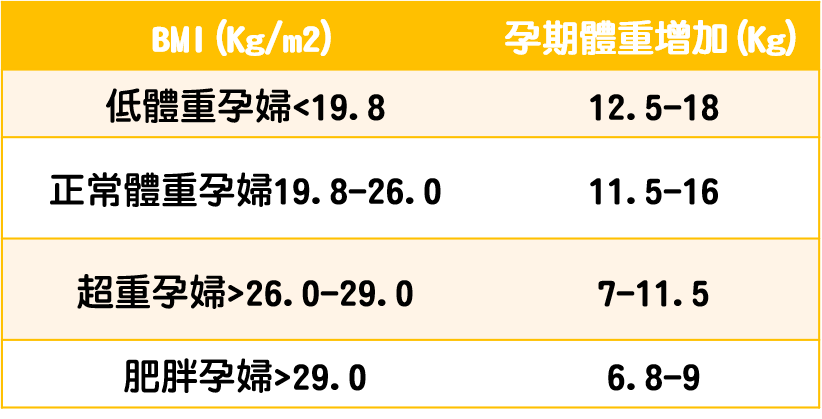 IOM根據孕前BMI推薦孕婦在孕期的體重增加如圖: