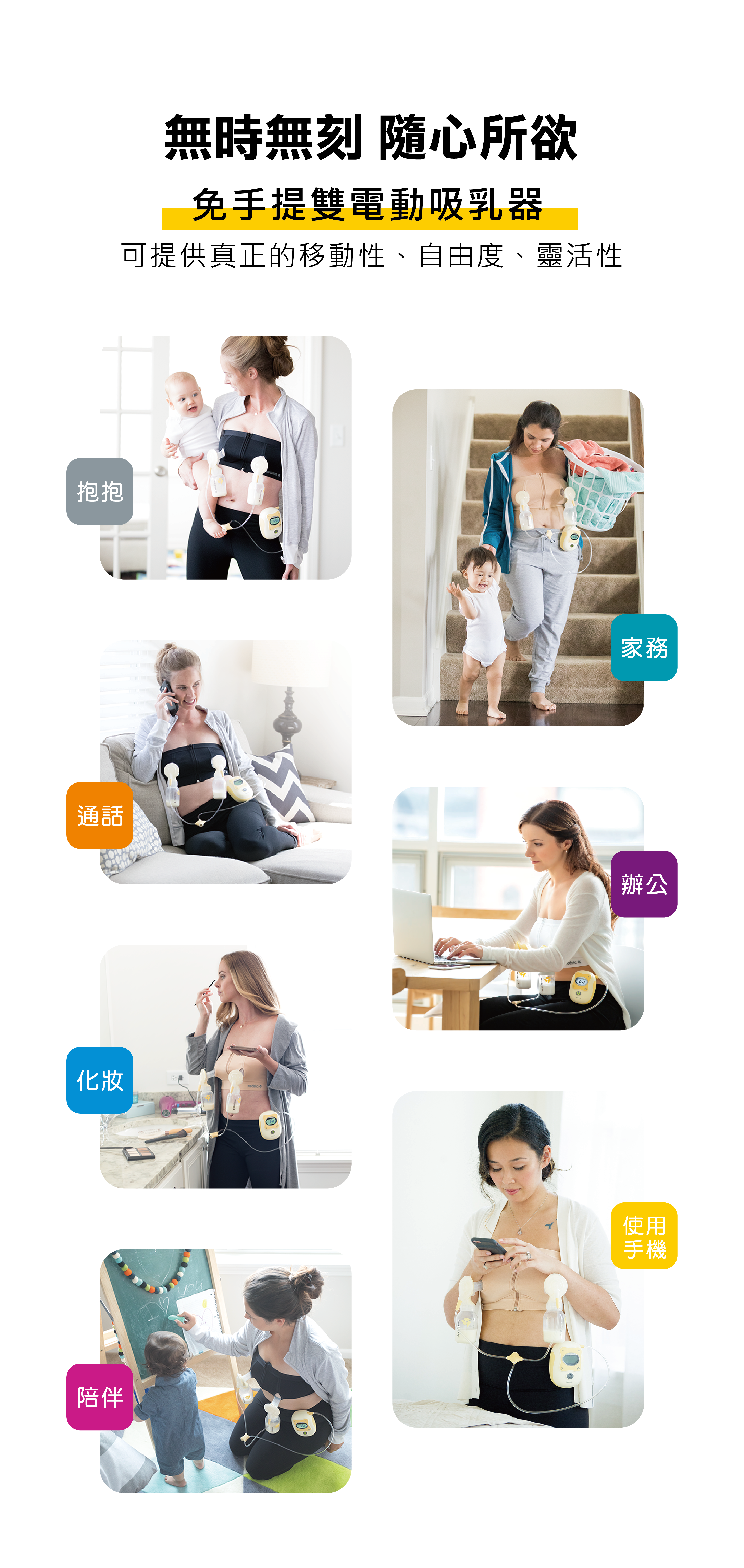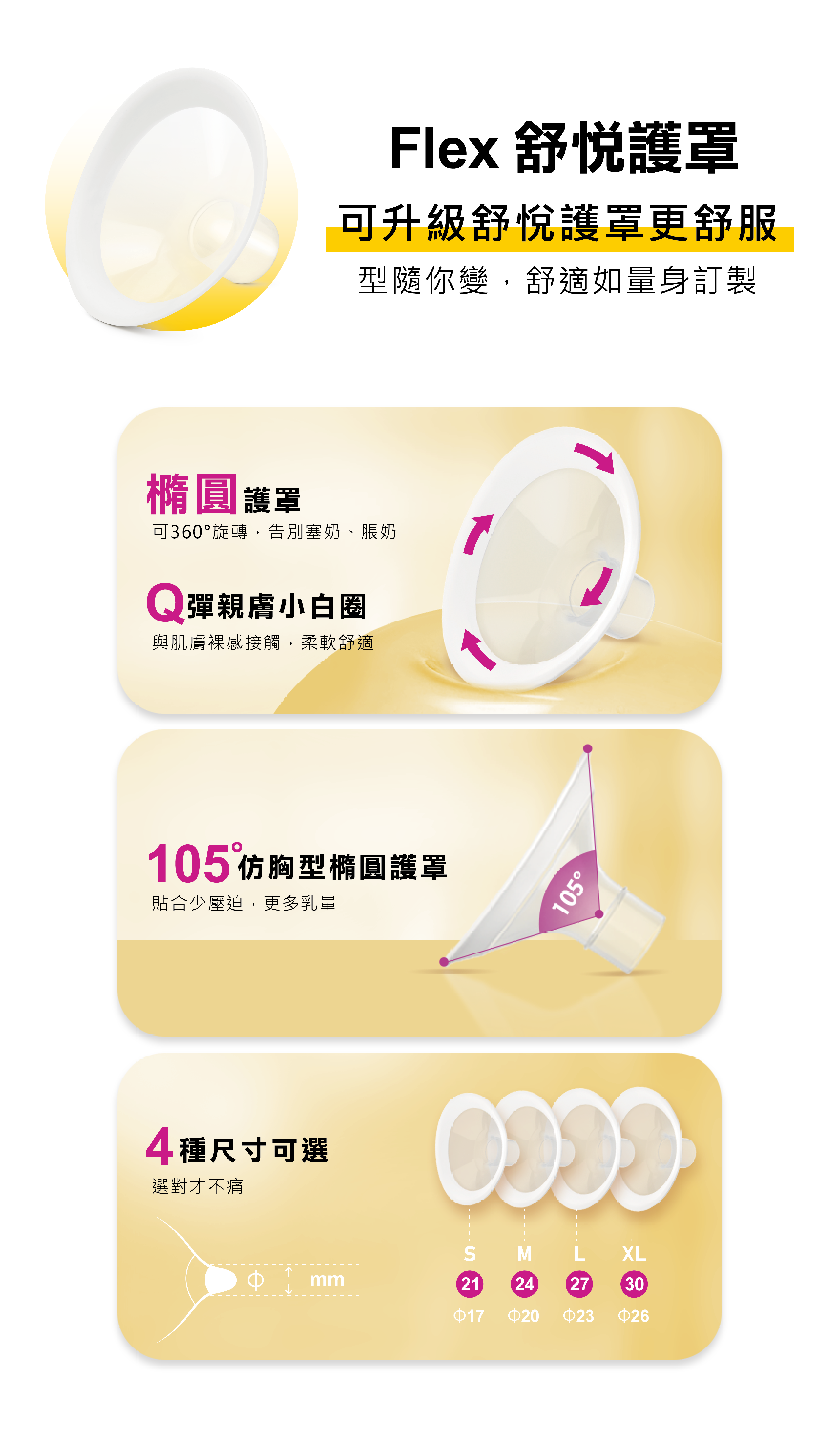 雙韻律®吸乳技術模擬寶寶自然吸吮節奏,帶來更舒適的吸乳體驗,適合樂於和伴侶分享哺餵體驗、預約外出或僅僅是需要休息一會兒的媽媽。 多選型吸乳護罩,輕鬆調整吸乳器貼合方式,從而協助媽媽找到最舒適、有效的吸乳姿勢。