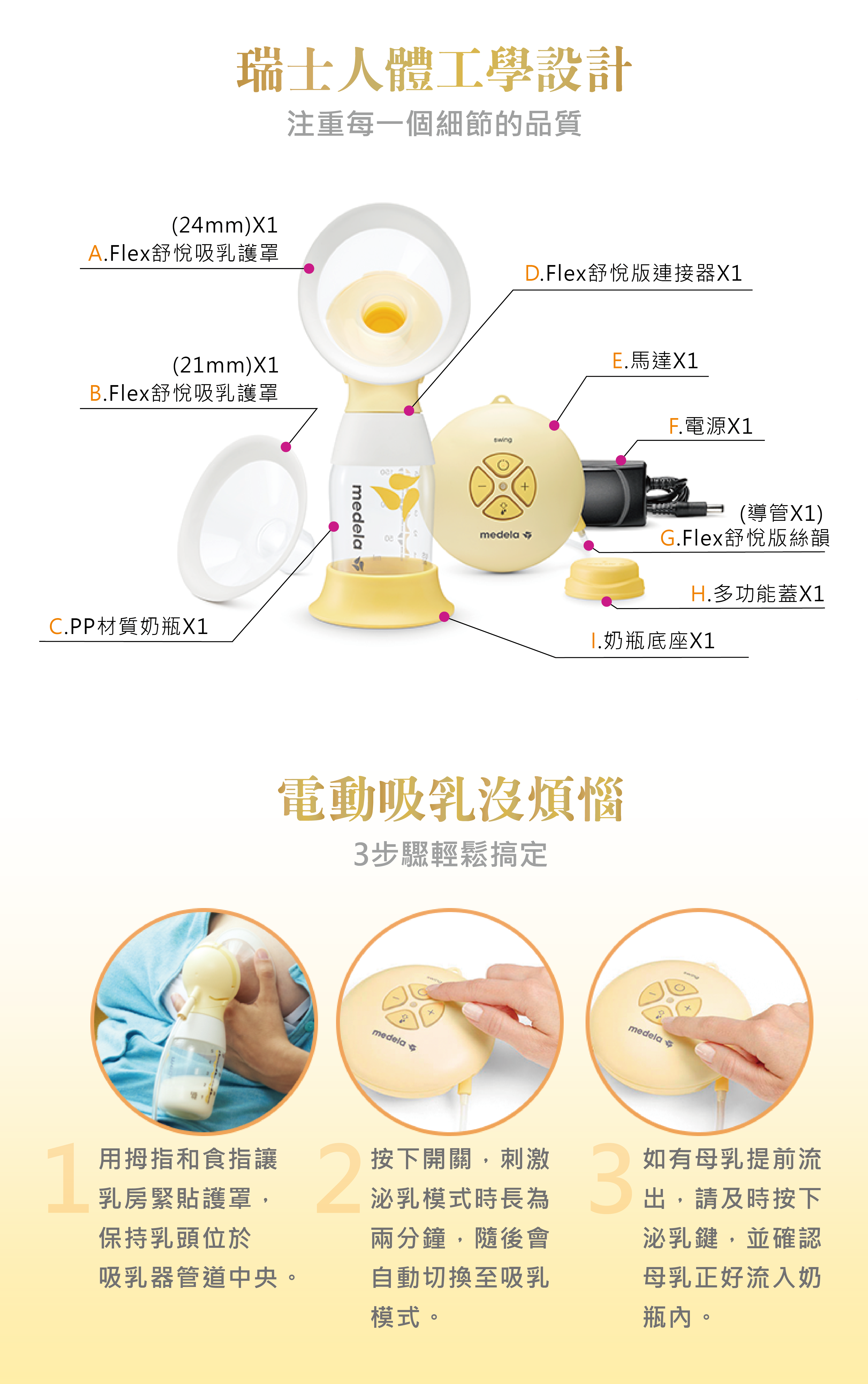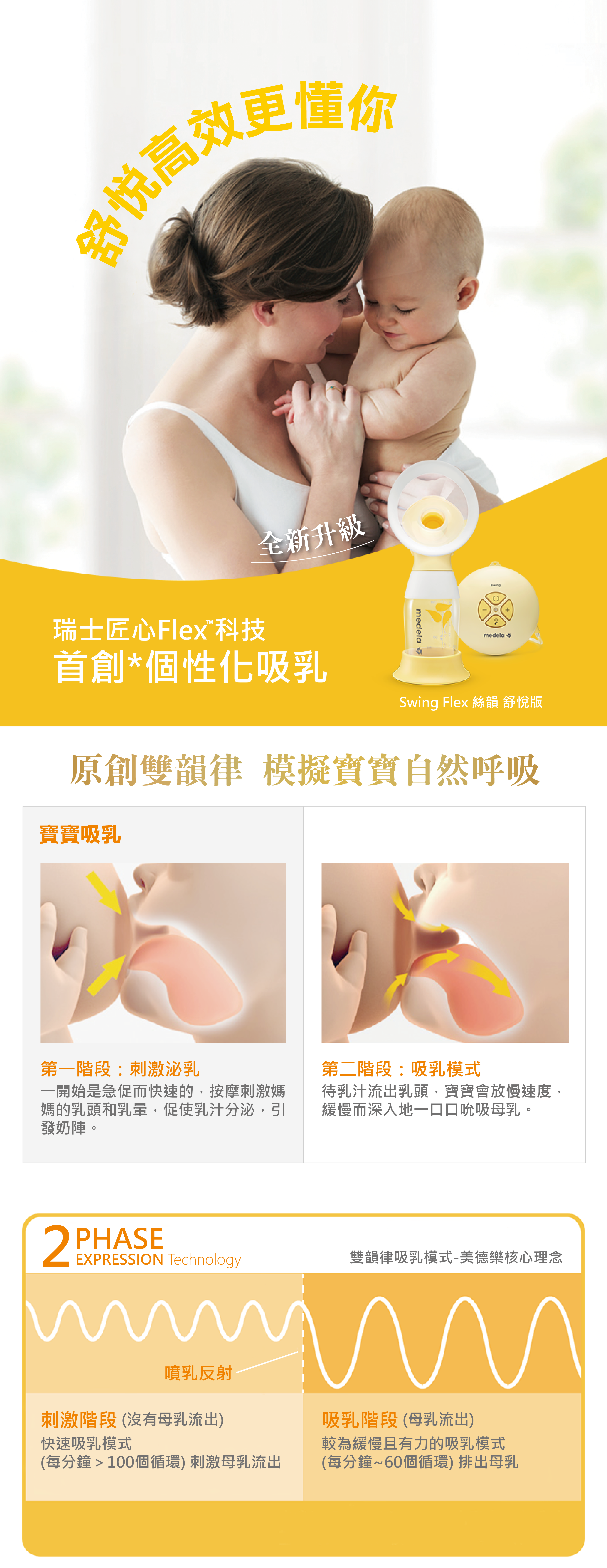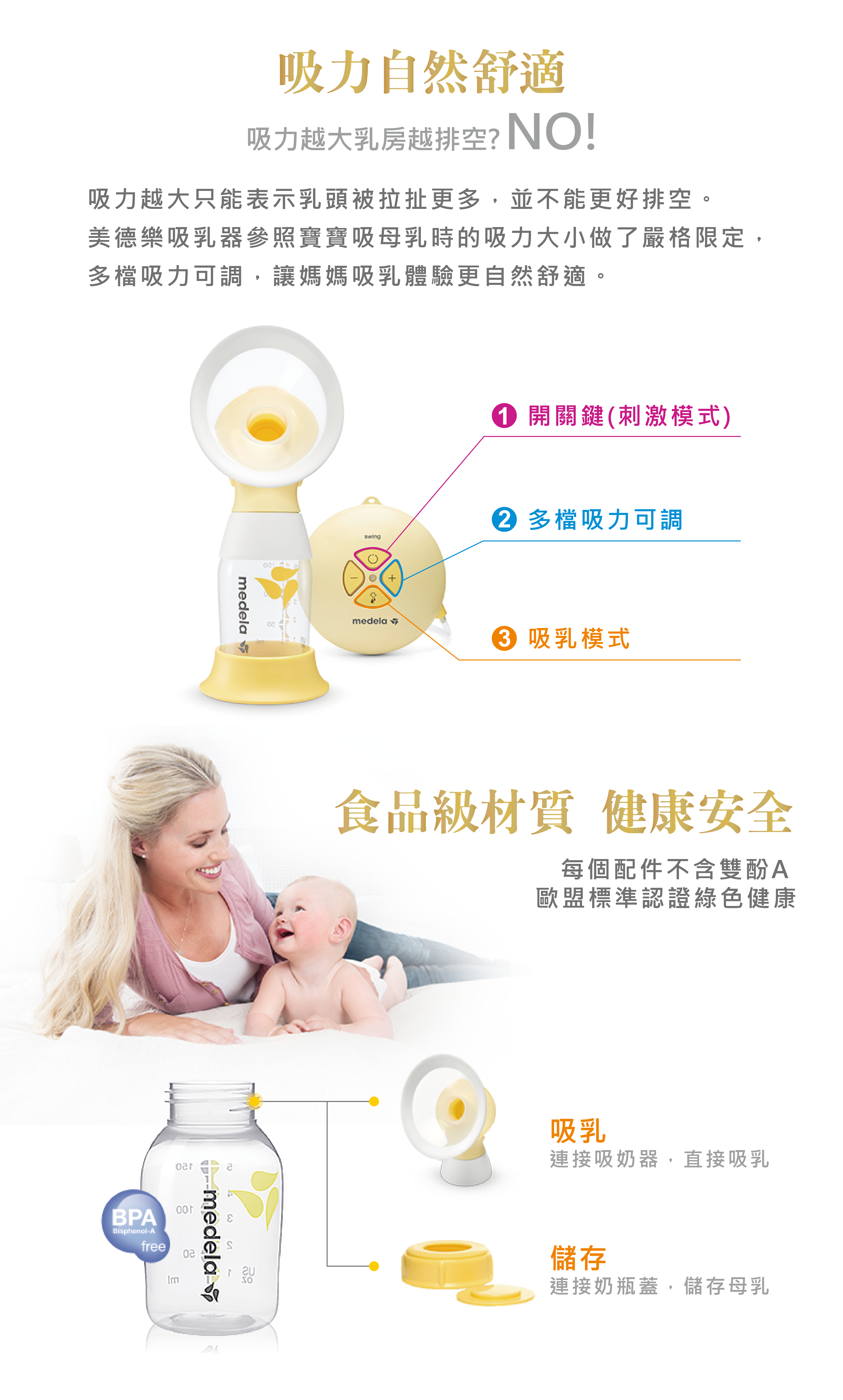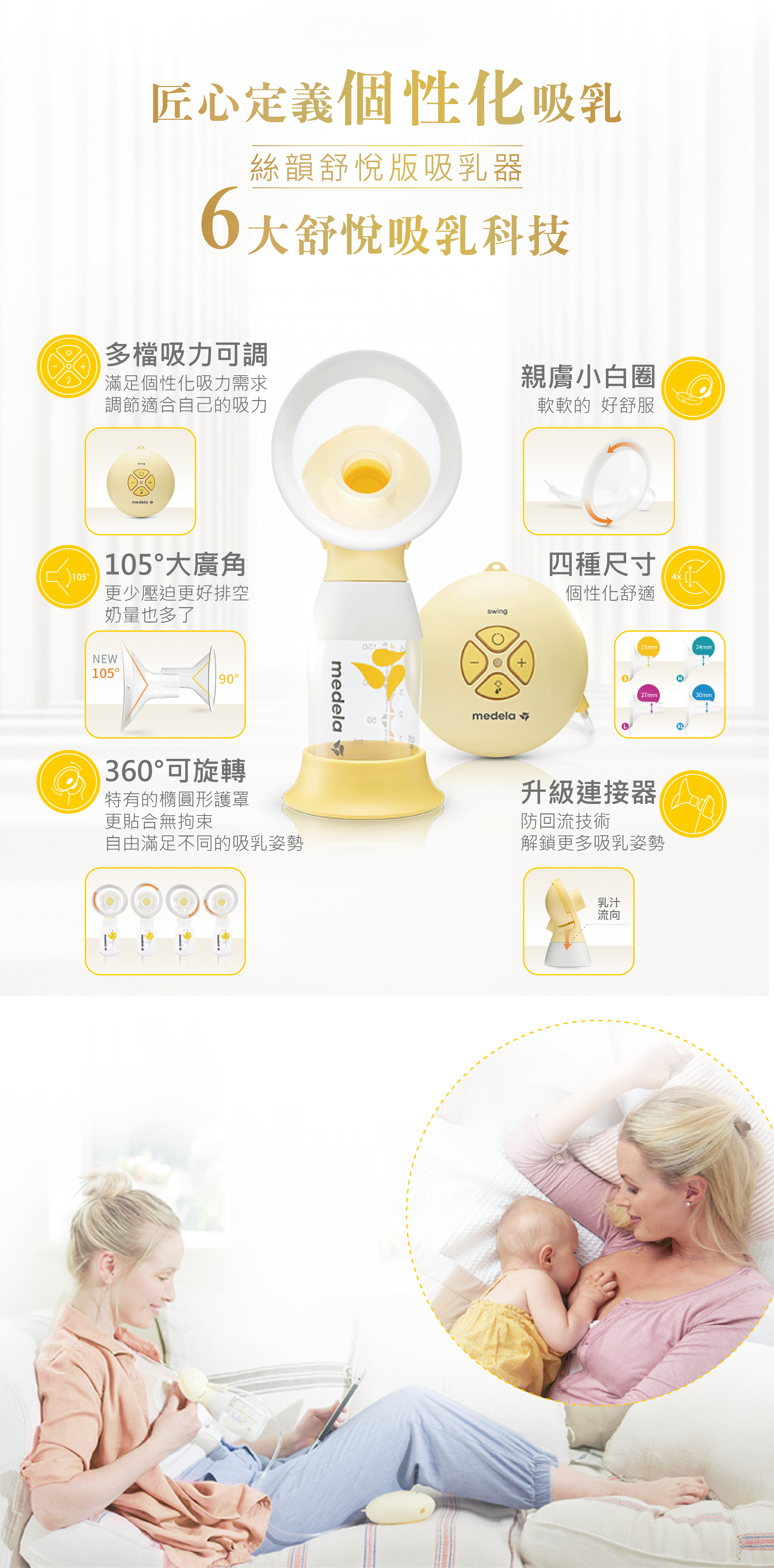 雙韻律®吸乳技術模擬寶寶自然吸吮節奏,帶來更舒適的吸乳體驗,適合樂於和伴侶分享哺餵體驗、預約外出或僅僅是需要休息一會兒的媽媽。 多選型吸乳護罩,輕鬆調整吸乳器貼合方式,從而協助媽媽找到最舒適、有效的吸乳姿勢。